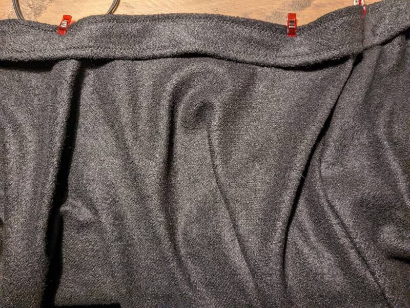 - Naai nu de voor- en achterpanden aan elkaar. Voor mijn wollen stof gebruik ik een microtex naald en heb ik de naaimachine ingesteld op een zigzag steek.